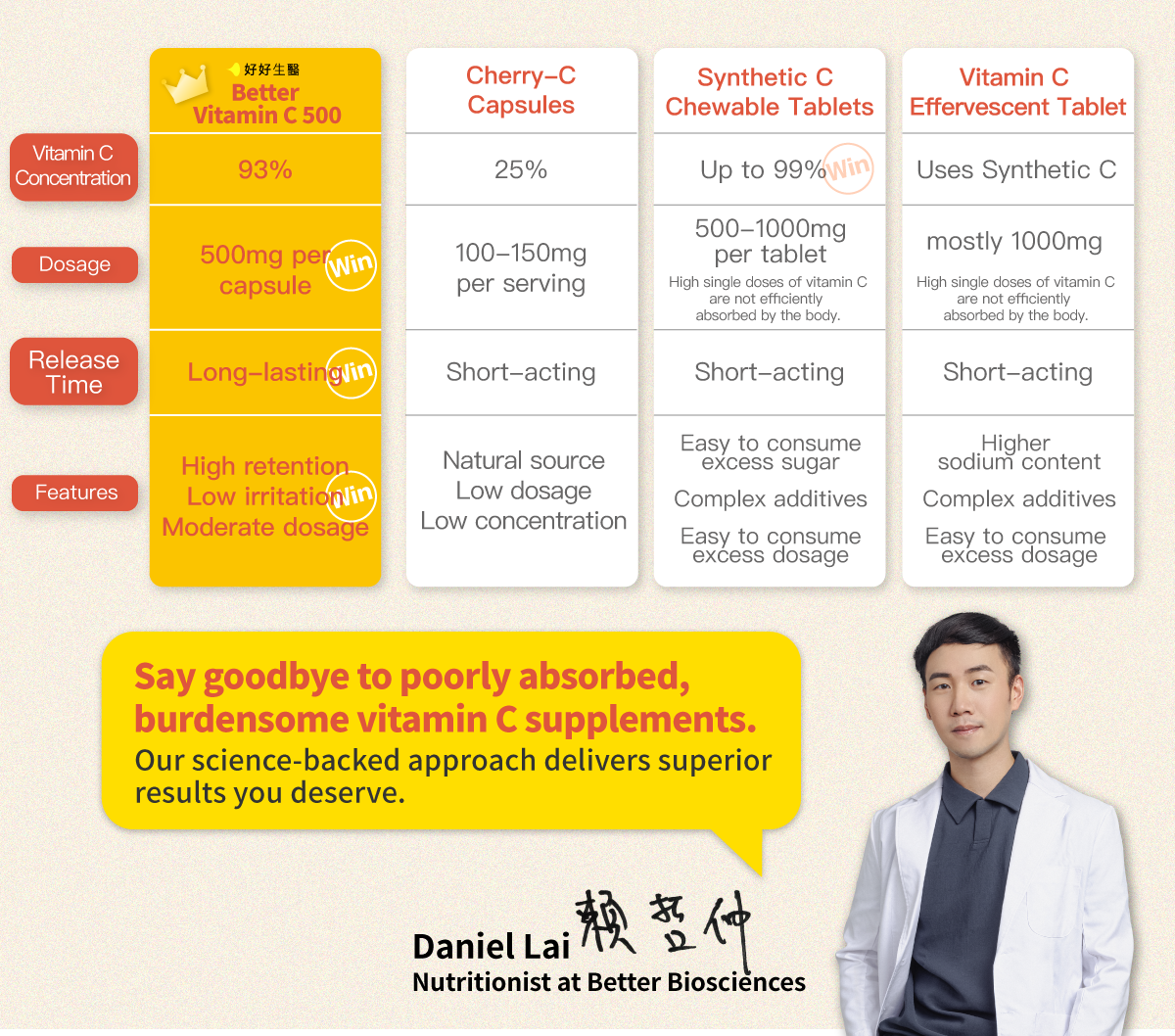 Better Vitamin C 500 is formulated using high-quality, safe food-grade ingredients. You can use it with confidence. For general maintenance, take one capsule daily. For enhanced benefits, you may increase to two capsules per day.