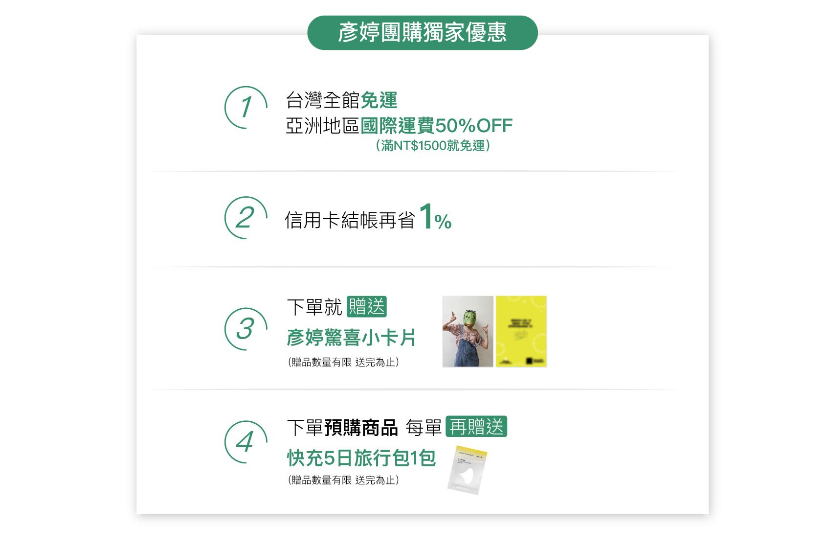 團購免運門檻為 台灣全館免運、亞洲地區滿一千五免運(含港澳、日本、韓國、新加坡、馬來西亞等)、北美/歐洲/大洋洲滿五千免運。