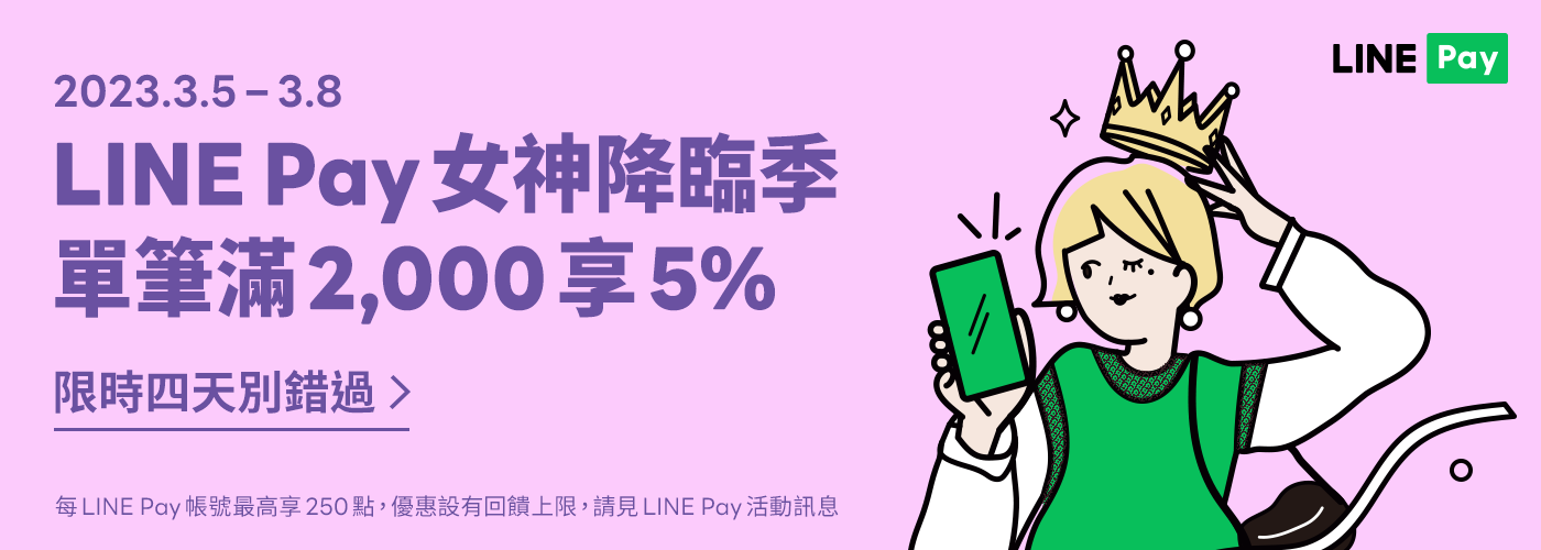 活動名稱:38女王節用LINE Pay,滿額享LINE POINTS 5%回饋!