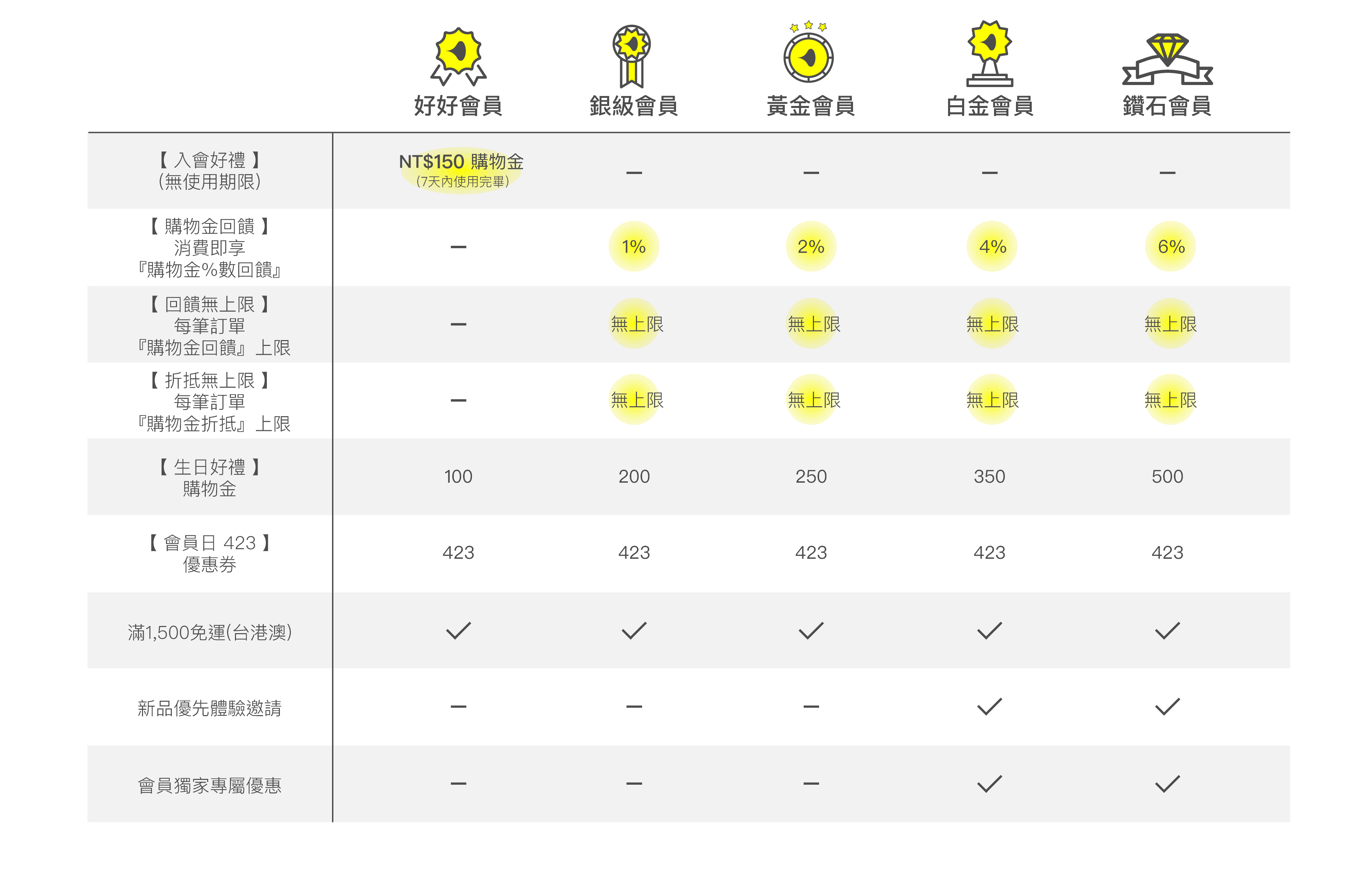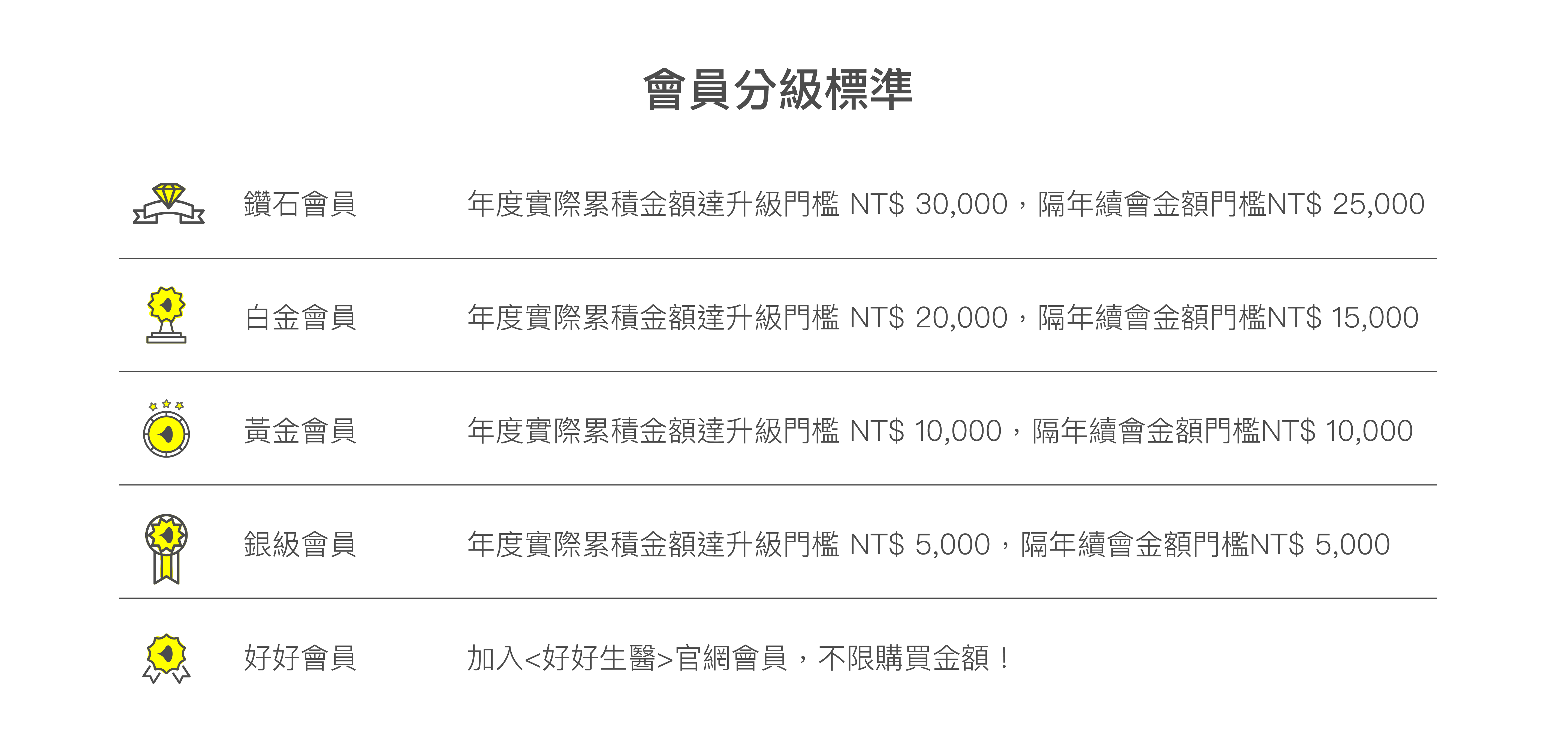 註2:若取消訂單退款後累計金額未到等級門檻,將依實際累積消費金額,調整為相對應的會員分級。