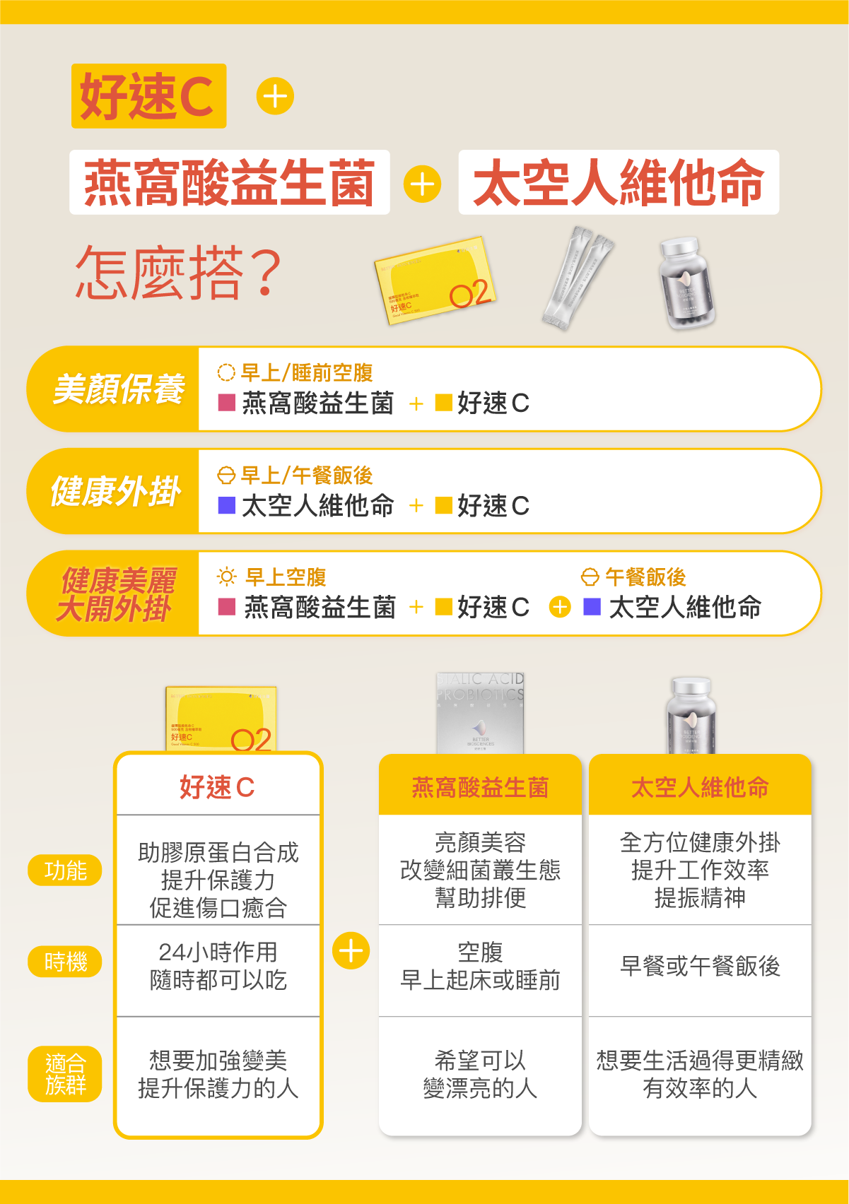 ▸ 美顏外掛:好速C X 燕窩酸益生菌,24小時都在變美