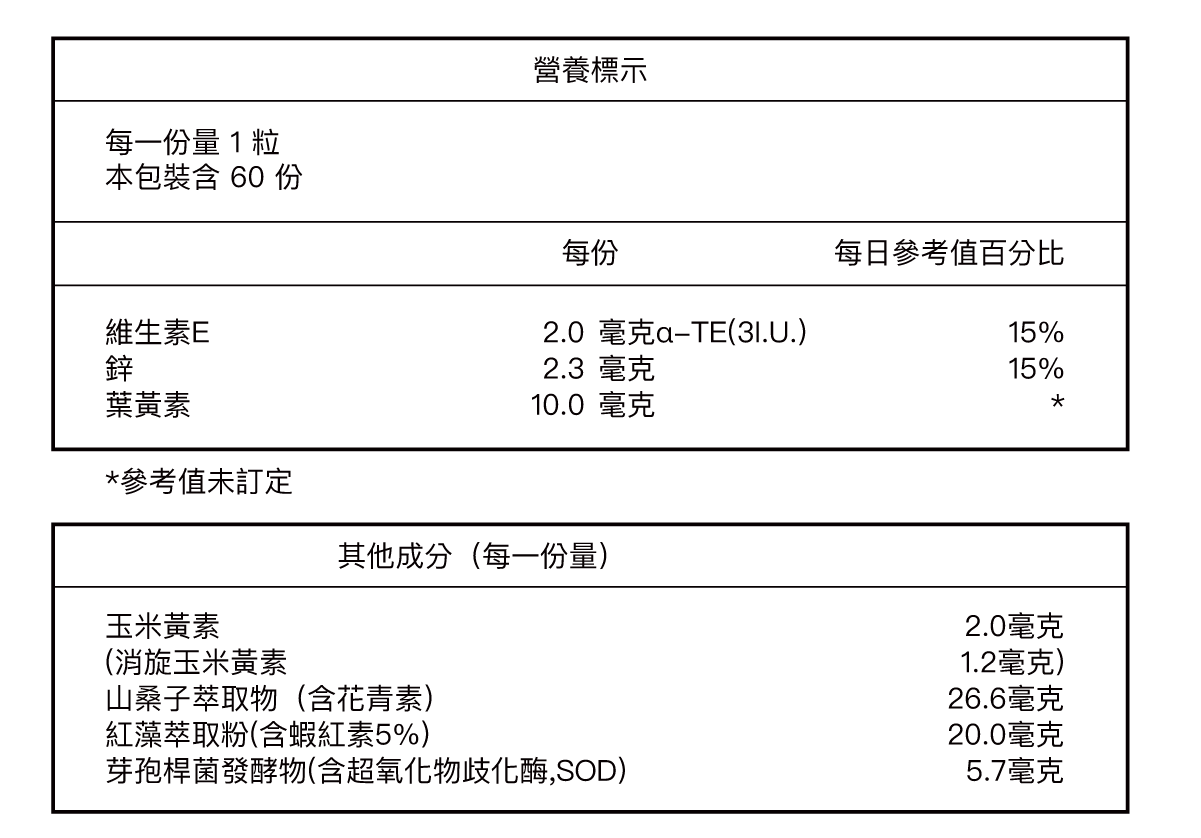 內容物:亞麻仁油粉(亞麻仁油、麥芽糊精、麥芽糖漿、酪蛋白鈉、脂肪酸甘油酯、二氧化矽、多磷酸鈉、混合濃縮生育醇(抗氧化劑)、L-抗壞血酸棕櫚酸酯(抗氧化劑))、微結晶狀α-纖維素、金盞花萃取粉(金盞花萃取物、糊精、糖、阿拉伯膠、濃縮d-α-生育醇(抗氧化劑)、玉米澱粉)、山桑子萃取物、馬鈴薯澱粉、紅藻萃取粉(紅藻萃取物、濃縮 d-α-生育醇(抗氧化劑))、甘胺酸鋅、智利酒果萃取物(智利酒果萃取物、麥芽糊精)、二氧化矽、維生素E 50%(乙酸dl-α-生育醇酯、乾燥葡萄糖漿、辛烯基丁二酸鈉澱粉、二氧化矽)、硬脂酸鎂、芽孢桿菌發酵物(糊精、芽孢桿菌Bacillus amyloliquefaciens(含SOD)、食鹽、蟲膠)