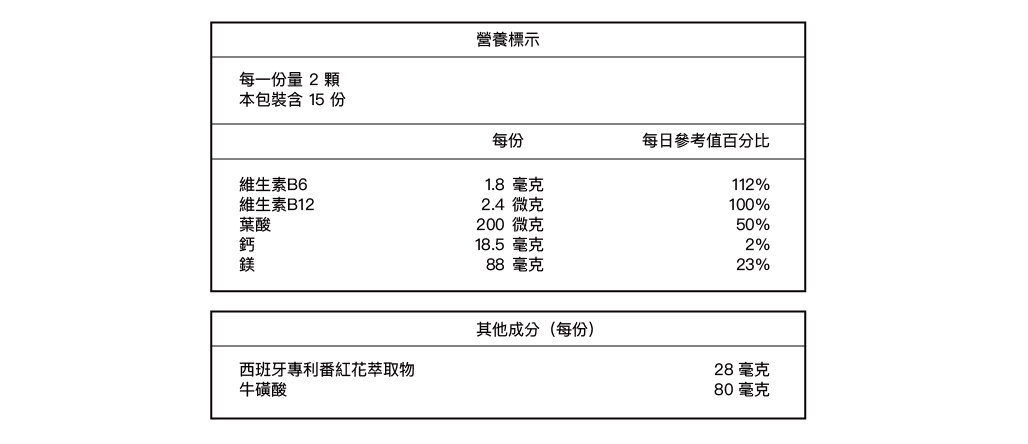 主要成分|複合甘胺酸鎂(甘胺酸鎂、檸檬酸)、微結晶狀α-纖維素、牛磺酸、磷酸鈣、番紅花萃取(番紅花萃取、糊精)、硬脂酸、硬脂酸鎂、二氧化矽、維生素B6、葉酸、維生素B12。