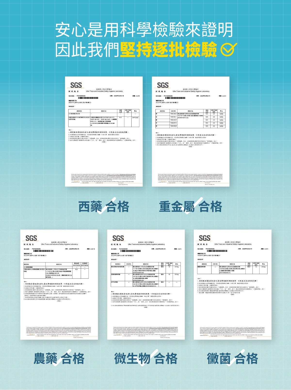 ▸ 檢驗通過:委託公正第三方 SGS 檢驗,西藥、農藥殘留、微生物、重金屬、塑化劑、酵母菌與黴菌全面合格