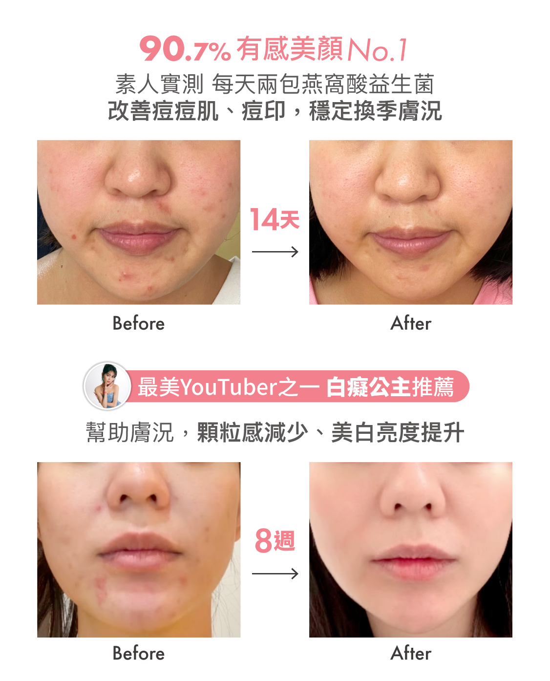 燕窩酸益生菌能在體內自然產生燕窩酸,透過自身代謝機制,提升身體燕窩酸的濃度,進而幫助水潤度與彈性,看起來更均勻明亮;和美容成分搭配時,更能產生協同作用,讓氣色更加緊緻、明亮。